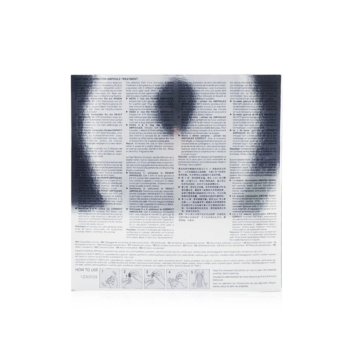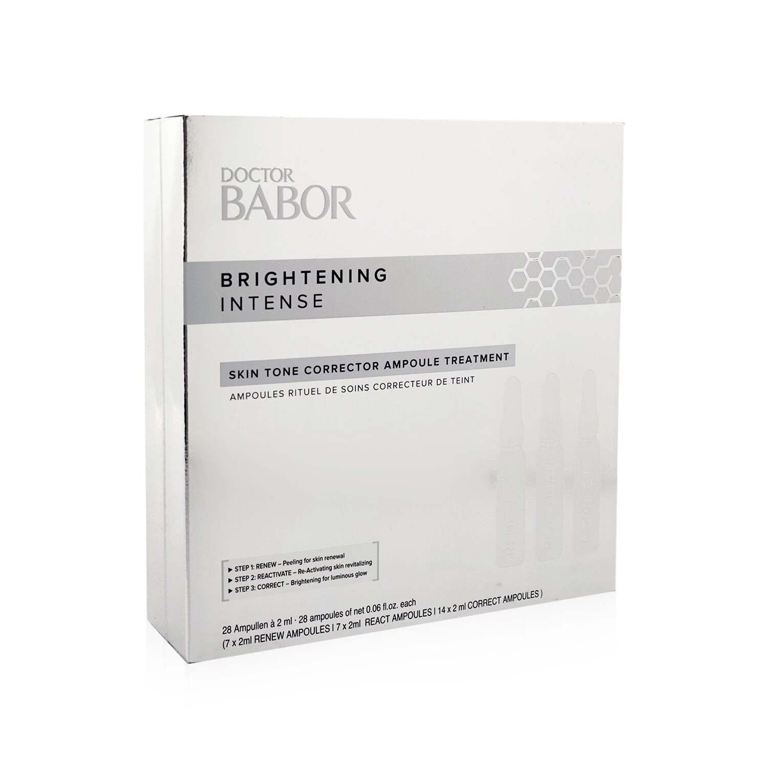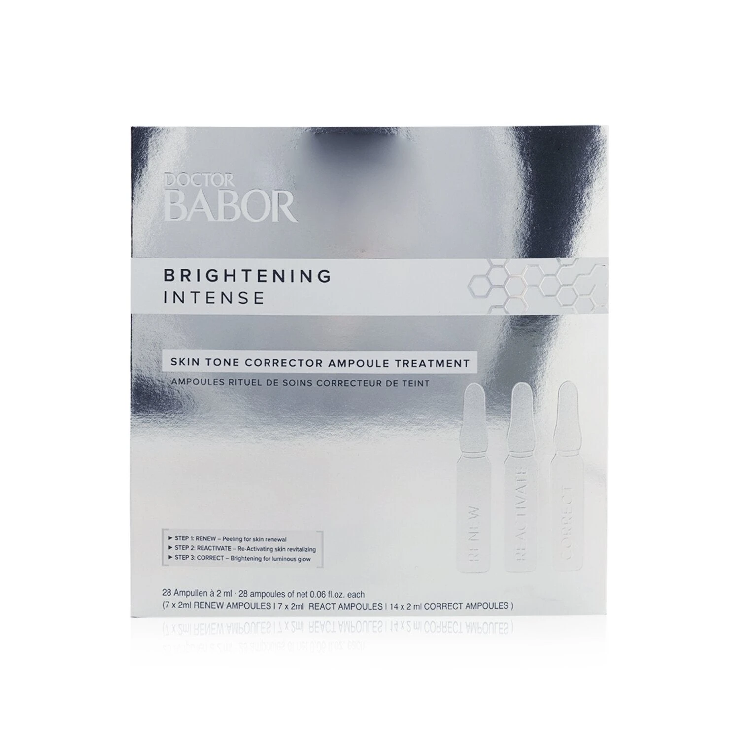 Step 1: Renew Ampoules – Peeling for skin renewal 7x2ml/0.06oz Step 2: Reactivate Ampoules – Re-activating skin revitalizing 7x2ml/0.06oz Step 3: Correct Ampoules – Brightening for luminous glow 14x2ml/0.06oz