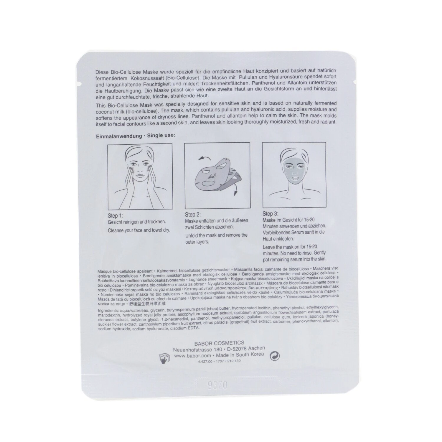 A calming sheet mask with a fleece-like texture Made with Pullulan & Hyaluronic Acid specifically designed for sensitive skin Bio-Cellulose made from Fermented Coconut Juice helps thoroughly & intensely hydrate skin Fits to the unique contours of the face like a second skin Formulated with Power Peptide to promote skin’s natural rejuvenation process & combat environmental factors Contains Allantonin & Panthenol to provide intensive moisture & bind moisture in skin Reveals a soothed, fresh & radiant-looking complexion Non-comedogenic